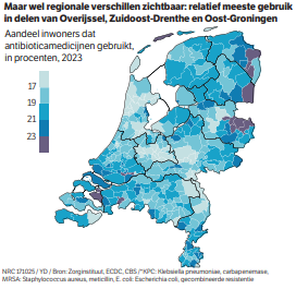 Maar binnen Nederland zijn de regionale verschillen groot. In dunbevolkte regio’s zoals Oost-Groningen gebruikt meer dan 20 procent van de inwoners jaarlijks antibiotica, terwijl dat in grote steden zoals Utrecht 16 procent is. Naast de gezondheid van de inwoners, speelt hierbij ook het type huisarts een rol.